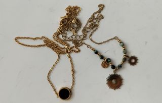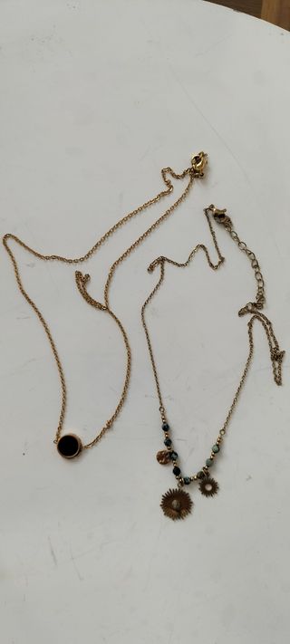 Lote de bisutería de dos colgantes - Collar con colgante redondo negro. - Collar con cuentas verdes y negras y colgantes de sol. - Cierre de mosquetón.