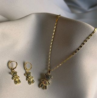 Conjunto de osos en oro laminado de 18 quilates. - Diseño de osito. - Detalle de circonitas verdes.