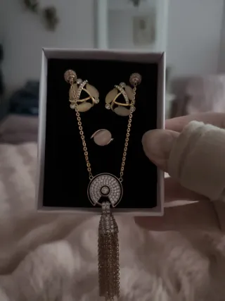 Conjunto de bisutería con un diseño elegante y moderno. - Pendientes con detalles triangulares y piedras. - Collar con colgante circular y flecos. - Anillo a juego con piedra ovalada.