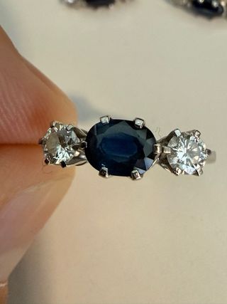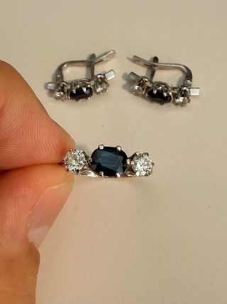 Elegante conjunto de sortija y pendientes de la época de los años 60-70. Las piezas combinan la intensidad del zafiro con el brillo de los diamantes. - Sortija con zafiro central y dos diamantes laterales. - Pendientes a juego con zafiro central y dos diamantes cada uno. - Diseño clásico y atemporal. Peso total de las 3 piezas: 5,98gr