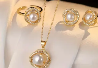 Elegante conjunto de joyería que incluye pendientes, colgante y anillo. Cada pieza presenta una perla central rodeada de un diseño intrincado con detalles brillantes. - Diseño con perla sintética y diamante de imitación. - Acabado en tono dorado.