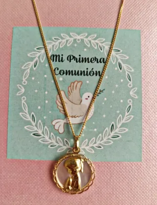 Precioso conjunto de joyas para Primera Comunión. Todo hecho de Plata de Ley y baño de Oro - Cadena de 45, con medalla de Virgen Niña sobre base de nácar. - Pulsera con perlas de río - Pendientes y anillo a juego. El anillo es adaptable para cualquier talla.