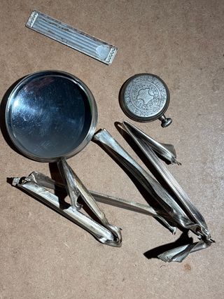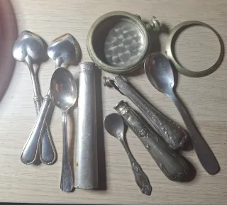 Conjunto de artículos de plata de ley Tofos contratados, el marco probado con acido y piedra de toque +100 gramos de plata, ideal inversion