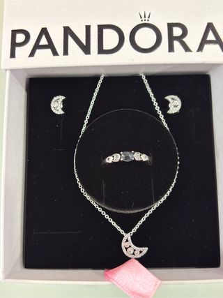 Conjunto de joyería en caja de rosas con un diseño de la luna y mujer, es de plata de ley rodiada, la cadena mide 45 cm, el colgante y los pendientes unos 2 cm Producto nuevo