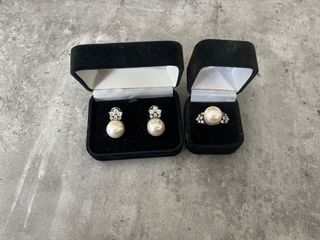 Elegante conjunto de joyería que incluye un anillo y un par de pendientes. - Anillo con perla central y detalles brillantes. - Pendientes colgantes con perla y adornos. - Fabricado en plata prueba realizada.