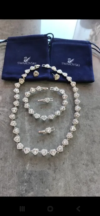 Elegante conjunto de joyería con un diseño de corazones. Incluye collar, pulsera y pendientes. - Piezas con incrustaciones brillantes. - Cierre de pulsera y collar seguro. - Presentado en sus bolsas originales.