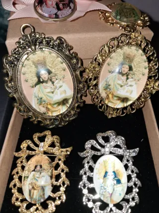 Aderezos de fallera, huertana, valenciana. broches, agulla de pit. Todos diferentes y únicos. Hechos a mano, artesanalmente. No encontrarás otra caramba o medalla con la Virgen de los desamparados igual. También medalla de san José. Customizables, personalizables. También relicarios personalizables y broches para abanico con cadena desde 50cm, diseños elaborados. Relojes antiguos para caballeros personalizables. -Acabados: oro, oro viejo envejecido, plata, plata vieja, bronce, latón. -Colgantes con la Verge desde 3€ depende del tamaño: 13x18mm(3€) 18×22(5€) 20×25 (8€) 30x40 (10-12€) Caramba + lazo color a elegir + broche, +2€