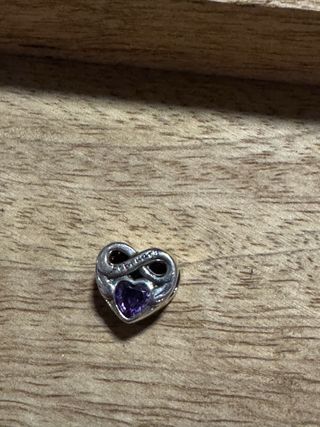 Charm con forma de corazón y una piedra morada que representa el mes de febrero. El charm es de plata y tiene un diseño delicado. - Diseño de corazón. - Piedra central morada. - Material: Plata.