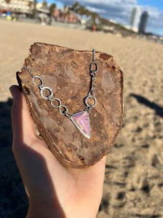 Elegante collar con cadena de plata y un colgante triangular de fosfosiderita lila. Una pieza única. - Única unidad. - Cadena de plata forzada a mano - Piedra fosfosiderita de diseño triangular. - Hecho a mano por @zane.joyas