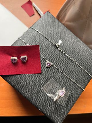 conjunto de joyería de plata con un diseño de corazón. - Incluye collar, par de pendientes y anillo ajustable - Detalle de piedras moradas y plateadas.
