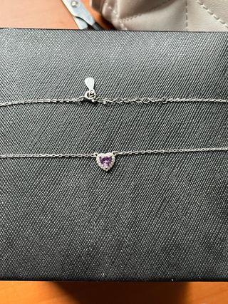 Preciosa pulsera y colgante con detalles en tonos morados y plateados. Se aprecian delicados cristales en la pulsera y una piedra central en el colgante. - Elegante conjunto de joyería. - Diseño sofisticado. - Incluye una pulsera de plata con piedras amatistas - Colgante de plata 925 de cristal con marquesitas incrustadas.