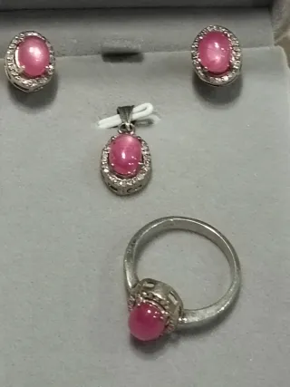 Elegante conjunto de joyas con un rubí estrella natural combuchión y diamantes naturales. - Piedra central: Rubí estrella natural. - Piedras complementarias: Diamantes naturales. - Diseño: Ovalado con detalles brillantes. Engaste de plata 925.