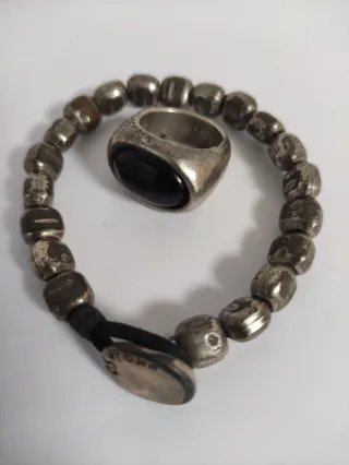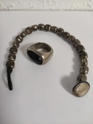 Conjunto de pulsera y anillo. - Pulsera con cuentas plateadas y cierre de cordón negro. - Anillo con piedra negra central. - Puesto queda muy bonito, llamativo y elegante!.