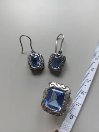 Elegante conjunto de joyería compuesto por anillo y pendientes. - Fabricado en plata de ley. - Adornado con piedras de un vibrante color azul. - Diseño clásico con detalles ornamentales.