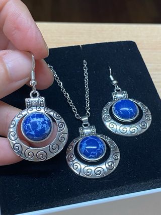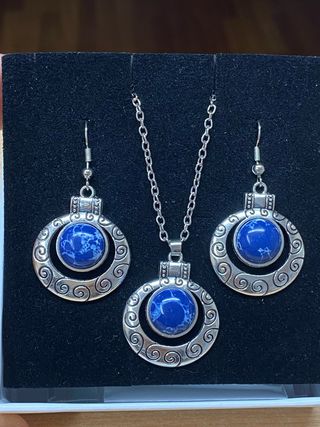 Elegante conjunto de joyería con colgante y pendientes. - Diseño circular con detalle de espirales. - Piedra central de color azul vibrante. - Acabado plateado.