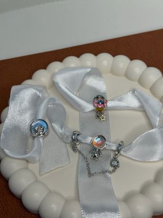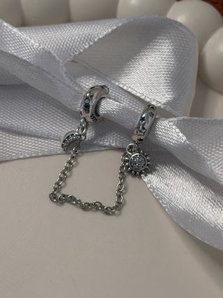 Conjunto de joyería de plata con varios dijes. - charm de cadena con detalles de sol y luna - charm de astronauta. - charm de nave espacial. - charm de globo de estrella con piedra lunar.