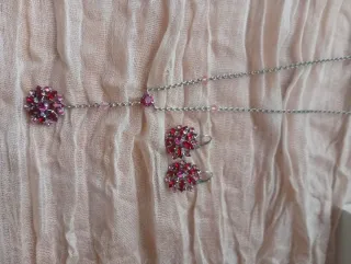 Conjunto Plata Anillo y Pendientes Piedras Rosas