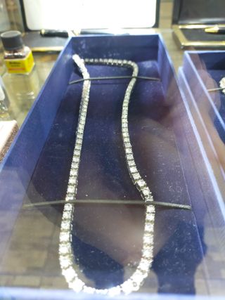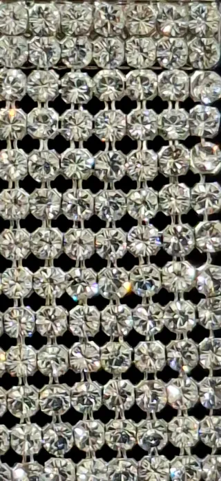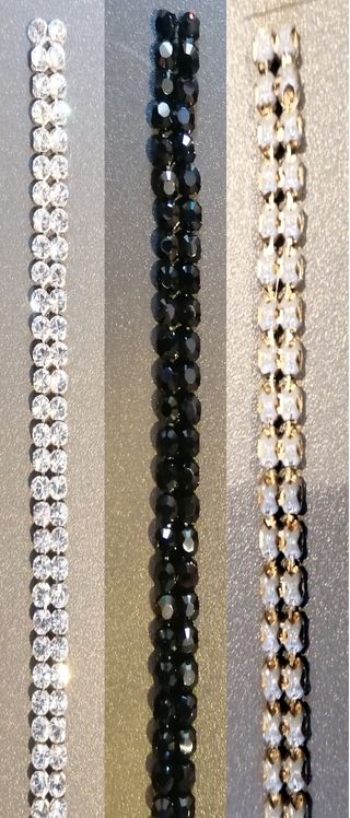 Cristales Swarovski transparentes montados sobre cadena metálica plateada. Con dos filas de cristales. Mantienen una tira de plástico por encima, para su almacenaje en el rollo por ser articuladas. Adjunto listado con fotos de otras piezas de Swarovski que tengo por si te interesa alguna. - Cristales de Swarovski. - Diseño de doble fila.