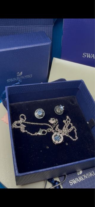 Elegante conjunto de joyería de la marca Swarovski. - Collar con colgante central y cadena ajustable. - Pendientes a juego con piedra azul. - Detalles en plata.