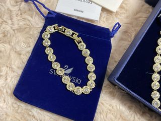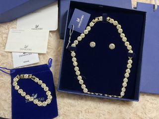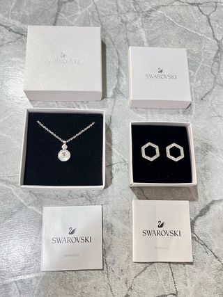 Elegante conjunto de joyería de la marca Swarovski original, ideal para complementar cualquier atuendo. - Incluye collar, pulsera y pendientes a juego. - Diseño con cristales brillantes. - Acabado plateado.