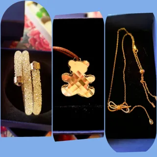 Ideal como regalo de San Valentín ♥️🏹💘 Se vende precioso conjunto de elegantes collaresy pulsera Swarovski. Color dorado rosado, blanco y pedrería. - El colgante del lazo infinito Lifelong Bow está bañado en oro, blanco y acabado en una circonita. - Colgante de oso de la colección Teddy de Swarovski. - Doble pulsera brazalete Swarovski Crystaldust en acabado plateado. - Entrega con cajas originales.
