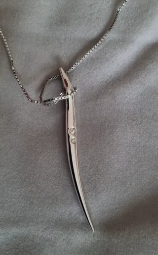 Elegante conjunto de joyería que incluye un collar y un par de pendientes. - Diseño moderno con incrustaciones de pequeños cristales. - Acabado plateado brillante. - Collar tiene cadena ajustable (40 - 45cm) Tienen pequeños signos de uso que se ven en las fotos