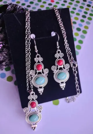 Joyería bisutería. Precioso colgante y pendientes de estilo étnico y bohemio. - Piedras turquesa de imitación. - Medidas Collar 39 cm + 8 cm cadena. Colgante 4 cm largo. Pendientes 8 cm largo. ### Magia brujería ocultismo sortilegio encantamiento runas protección Funko rockero moto Fashion hip hop Punk rock gótico motorista steampunk heavy metal Skull vikingo nórdico étnico bohemio wicca templario esotérico Runa oro plata titanio swarovski brillante perla