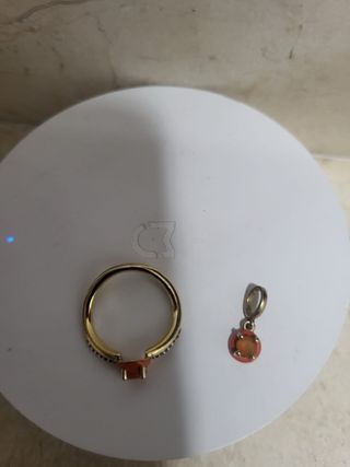 Elegante anillo con detalles en oro y una piedra central de color naranja. El diseño presenta una banda adornada con pequeñas piedras negras.Anillo talla 17.7. Colgante a juego Tous plata Vermel. - Material: Vermeil plata - Piedra central: Naranja. - Detalles: Piedras negras en la banda.