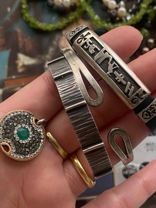3 pulseras y un colgante (una pulsera lleva cinta de piel con plata y son antiguas les falta buena limpieza tal como se muestra en fotos ) 51,8g 🔴porfavor mirar las medidas en fotos y toda la descripcion antes de comprar y no accepto devolución ! Gracias 🙏
