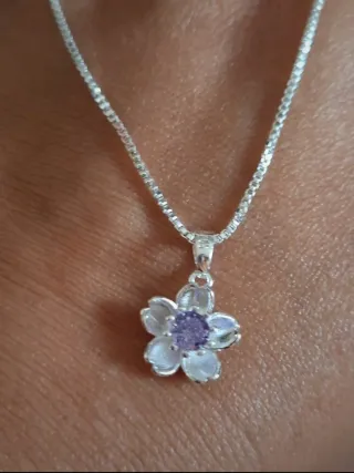 Elegante collar con un colgante en forma de flor. El centro de la flor está adornado con una piedra amatista. Se envía en cajita para regalo. #(sortijas, alianzas, alhajas, joyas, joyería, pulsera, pendientes, brazalete, tobillera, cadena, cordón, colgante, gargantilla, choker, collar, regalos, complementos, broche, minerales, gemas, piedras preciosas, piedras semipreciosas, piedras naturales, ópalo, ámbar, coral, turquesa, aguamarina, amatista, granate, zafiro, lapislázuli, rodocrosita, fluorita, turmalina sandía, cuarzo, esmeralda, rubí, topacio, Navidad).