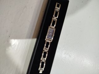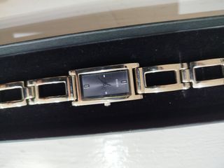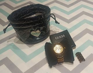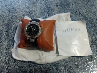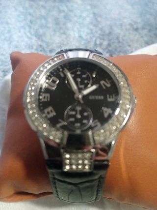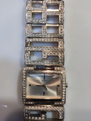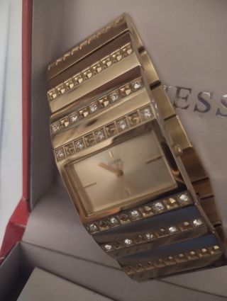 reloj joya Guess con pedrería, tiene en un esquina de la esfera una señal, funciona y no le falta ninguna piedra, usado solo en grandes celebraciones, brilla bastante al sol o luz,largo del reloj 16,5cm