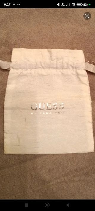 Sacó de tela Marca Guess color blanco roto letras plateadas para meter colgante, pendientes etc. Ideal para tu regalo hago envíos por wallapop y entrega en oficina de correos
