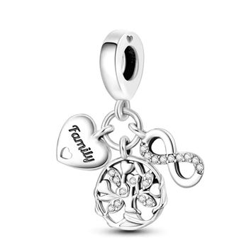 Este charm de Pandora está hecho de plata de ley 925. Presenta un diseño con varios elementos colgantes. - Charm con forma de corazón con la palabra Family grabada. - Charm con forma de árbol de la vida adornado con circonitas. - Charm con símbolo de infinito decorado con circonitas.