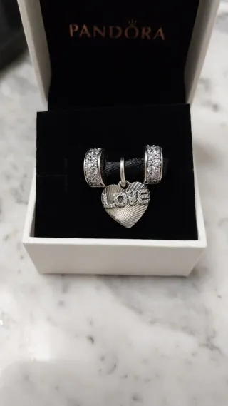 Nuevo. Precioso conjunto de dos charms de Pandora. - Charm con forma de corazón plateado con la palabra LOVE. - Charm redondo con circonitas turquesas.