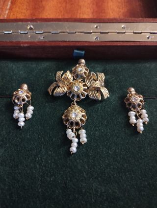 Elegante conjunto de joyería con un diseño de cruz adornado con perlas y detalles dorados. Incluye collar y pendientes y broche . - Collar con colgante de cruz y perlas. - Pendientes a juego con perlas. -Broche de perlas