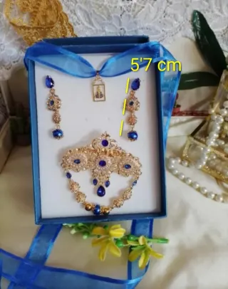 Aderezo fallera, fiestas regionales, etc. Con cinta de seda y medalla Virgen de los desamparados. Niñas. - Incluye collar, pendientes y broche. - Piezas delicadas con detalles en filigrana. - Adornado con brillantes circonitas azules y doradas.