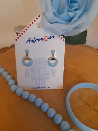 Precioso conjunto de bisutería para flamenca. Talla niña - Incluye collar, pulsera, pendientes y broche. - Diseño con cuentas celeste - Flor imitación rosa - Pendientes enganche tornillo *Más complementos moda flamenca y feria en mi perfil