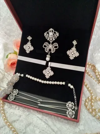 Conjunto de aderezo para fallera, tamaño niñas. - Diseño intrincado con detalles de pedrería y perlas. - Incluye broche central y pendientes a juego. - Adorno para el cabello. - Piezas de metal plateado. Precio no negociable