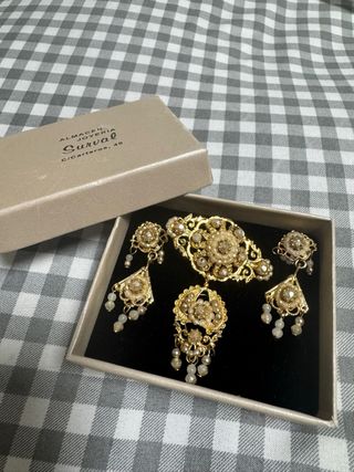 Conjunto de aderezo para fallera infantil. - Diseño con detalles dorados y perlas. - Incluye agujas traseras, pendientes y broche de pecho. No dispone de caja original, se entrega en la caja negra.