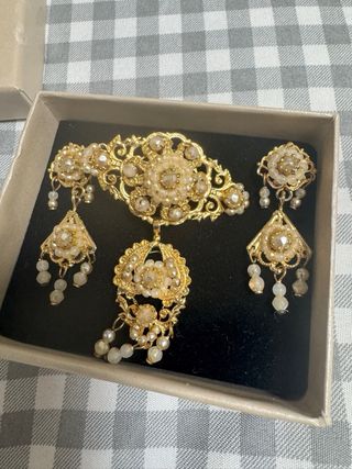 Conjunto de aderezo para fallera infantil, con un diseño elegante y detallado. - Broche principal con motivos florales. - Pendientes a juego con colgantes. - Collar de perlas con colgante. - Horquillas para el peinado.