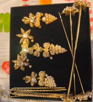 Conjunto de aderezos dorados con detalles de perlas y pedrería, ideales para niñas. - Diseño de racimo y flores. - Adornos con pedrería brillante. - Incluye horquillas y pasadores.