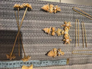 Indumentaria valenciana / fallera / Valencia/ niñas / dorado / aderezo Para niña de 5/6 a 9 años años Aderezo dorado : - 2 pendientes - 4 agujas moño grande - 2 pares de agujas para rodetes - Broche para el centro del pecho (joya). Necesita un lavado con bicarbonato para recuperar su brillo.