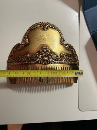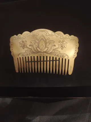 Peineta huertana para niña con un diseño tradicional y elegante. Perfecta para trajes regionales. Medidas 12 de ancho por 7,5 de alto - Elaborada en metal dorado. - Adornada con motivos florales. - Dentado fino.