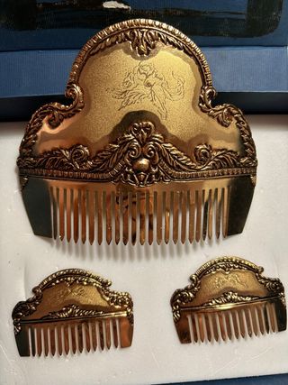 Conjunto de tres peinetas decorativas con un diseño ornamentado. - Peineta grande con detalle de ángel y rosa. - Dos peinetas pequeñas a juego. - Acabado metálico con apariencia dorada.