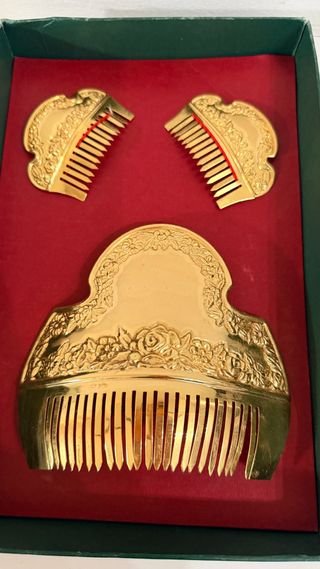 Conjunto de peinetas y horquillas de estilo fallero, con un acabado dorado. - Peineta principal con ornamentación. - Dos peinetas laterales. - Horquillas a juego.