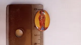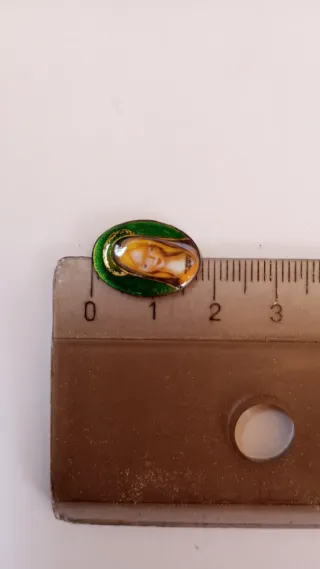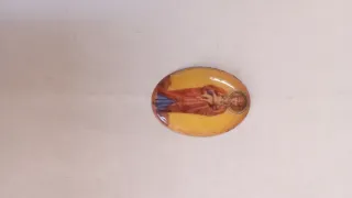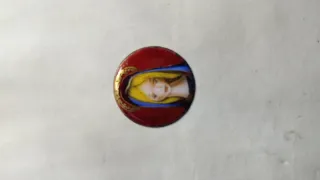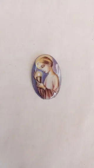 Detalle de esmalte al fuego con la imagen de una Virgen Niña. Esmalte sobre cobre . Ideal para terminar medallita de comunión - Diseño ovalado. - Representación de la Virgen Niña con halo.