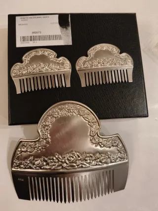 Conjunto de dos peinetas para niña con un diseño cincelado y acabado plateado. - Diseño floral y ornamental. - Acabado metálico brillante. - Usadas 2 veces