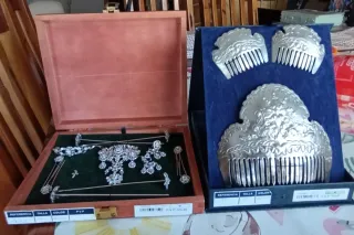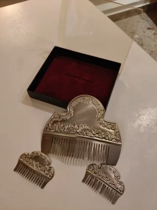 Conjunto de accesorios para fallera, ideal para niña o joven. Piezas con un diseño tradicional y elegante. - Incluye un peine grande y dos peinetas. - Elaborados con un acabado plateado. - Presentados en su caja original.