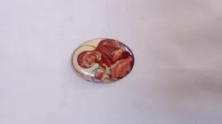 Precioso esmalte al horno con diseño religioso. Virgen ortodoxa con niño. - Forma ovalada. - Diseño multicolor con detalles en rojo.