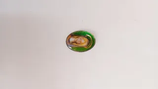 Detalle de rostro femenino con acabado en esmalte al horno. Esmalte Comunión Virgen niña fondo verde transparente a mano. - Esmalte cocido a 800°C. - Diseño ovalado con borde verde.